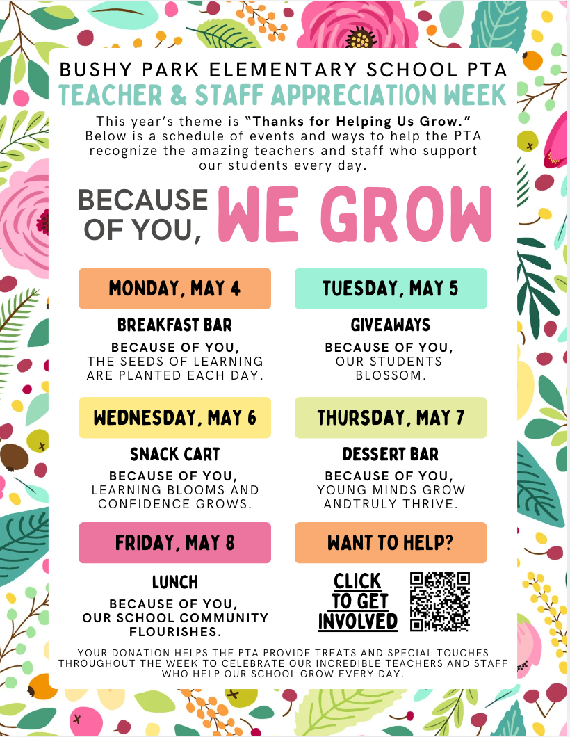 Our PTA works hard to make this week special, but we can’t do it without our amazing community. Your support helps provide the treats, surprises, and thoughtful touches that make our teachers and staff feel celebrated and appreciated.